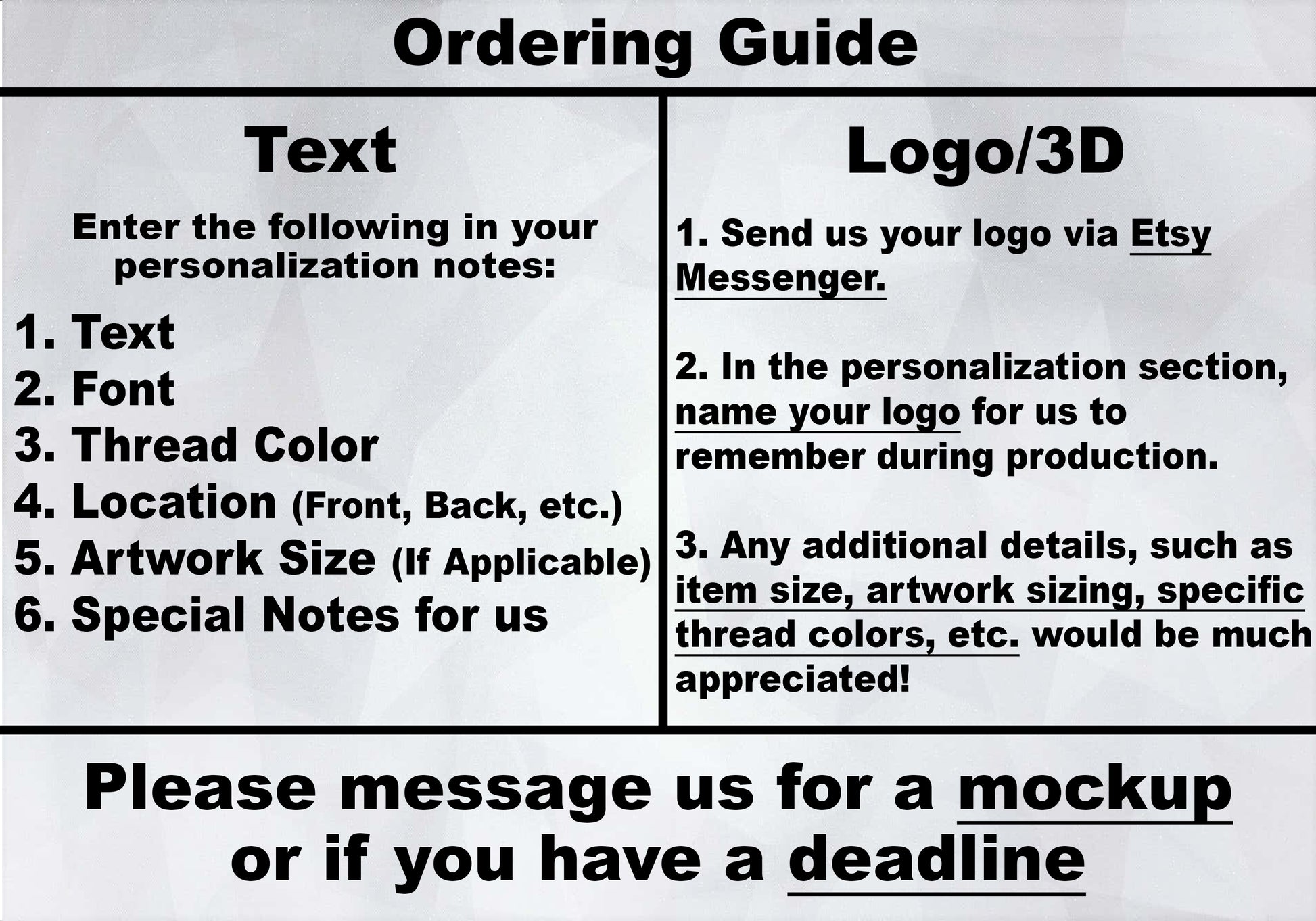 Please review each of the listing images to see important information, such as our ordering guide, text and logo placement, font and thread options, etc.