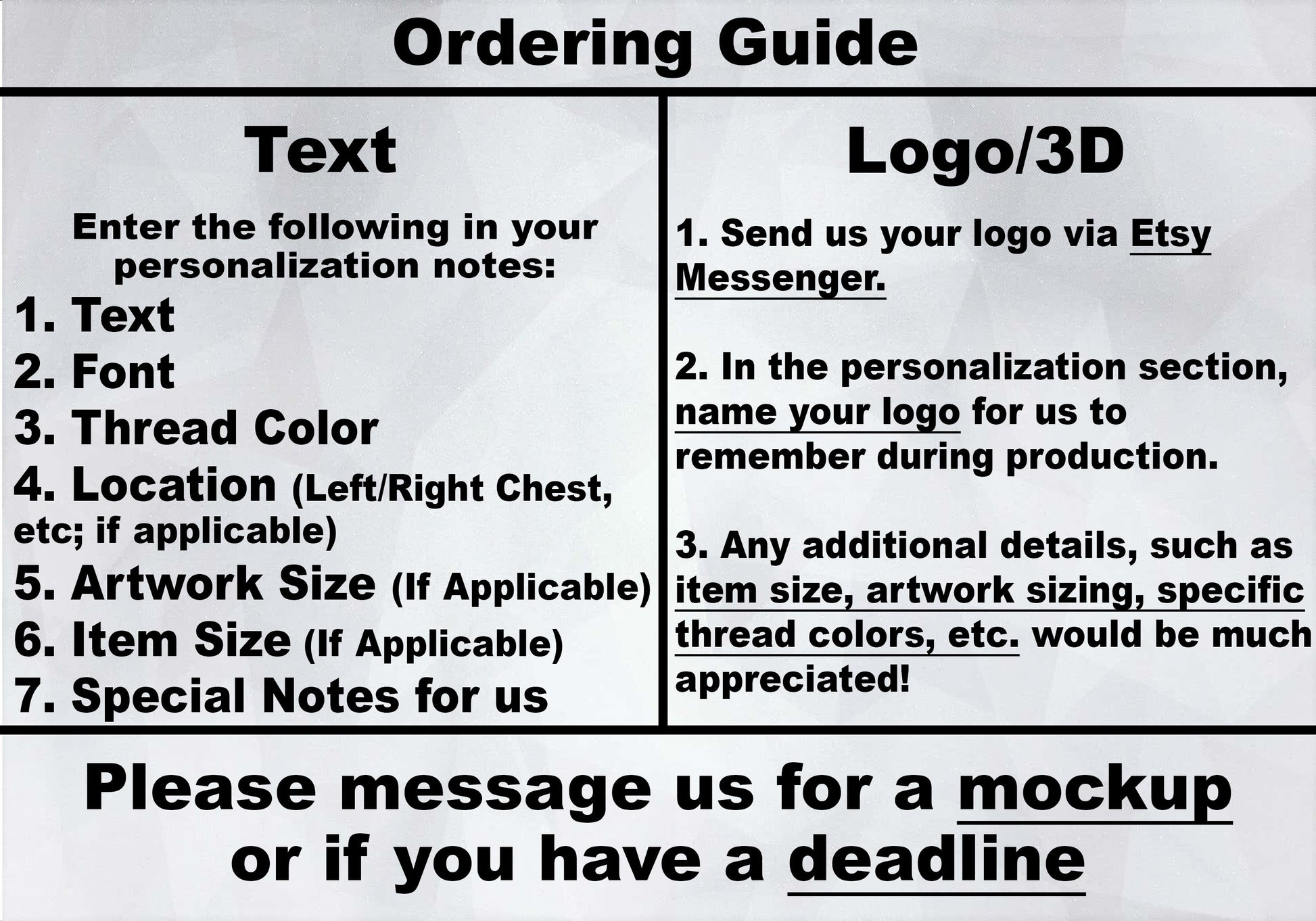 Please review each of the listing images to see important information, such as our ordering guide, text and logo placement, font and thread options, etc.